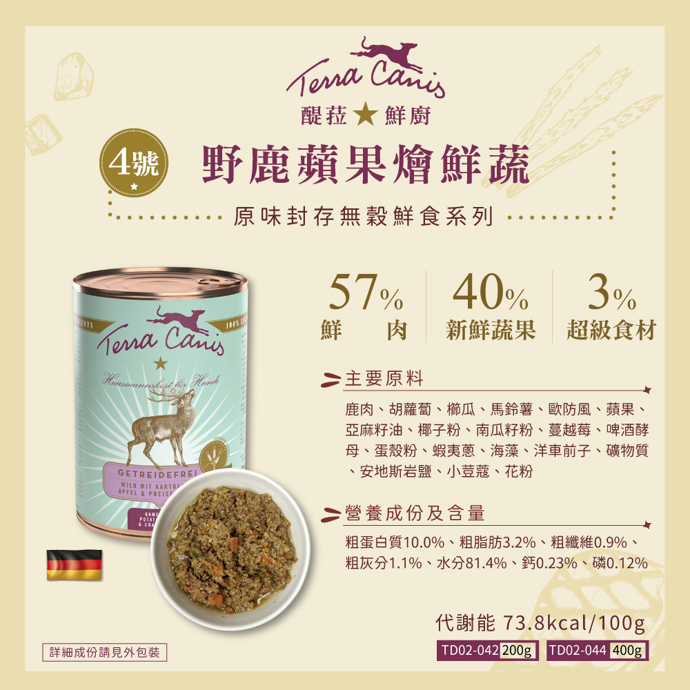 Terra Canis醍菈鮮廚|原味封存無穀犬罐 4號野鹿蘋果燴鮮蔬